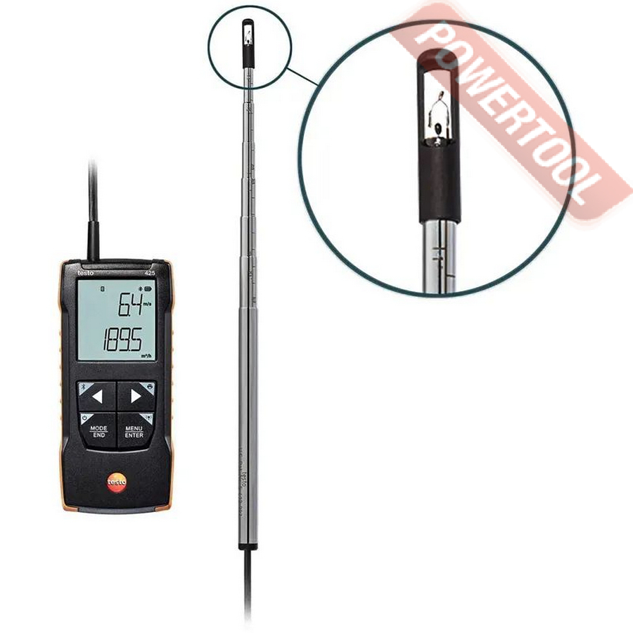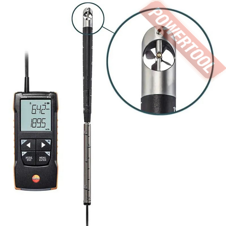 - Выносной зонд-крыльчатка. Компактный анемометр testo 416 со стационарно подсоединенным зондом-крыльчаткой 16 мм и с телескопической рукояткой (макс. 890 мм). обеспечивает еще большее удобство при проведении измерений, в том числе в труднодоступных местах.
