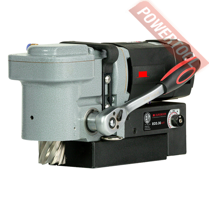 - Мощность 1200 Вт двигателя, передаваемая через трехступенчатый редуктор, позволяет сверлить с помощью коронок отверстия диаметром до 42 мм в стальных изделиях толщиной до 50 мм.