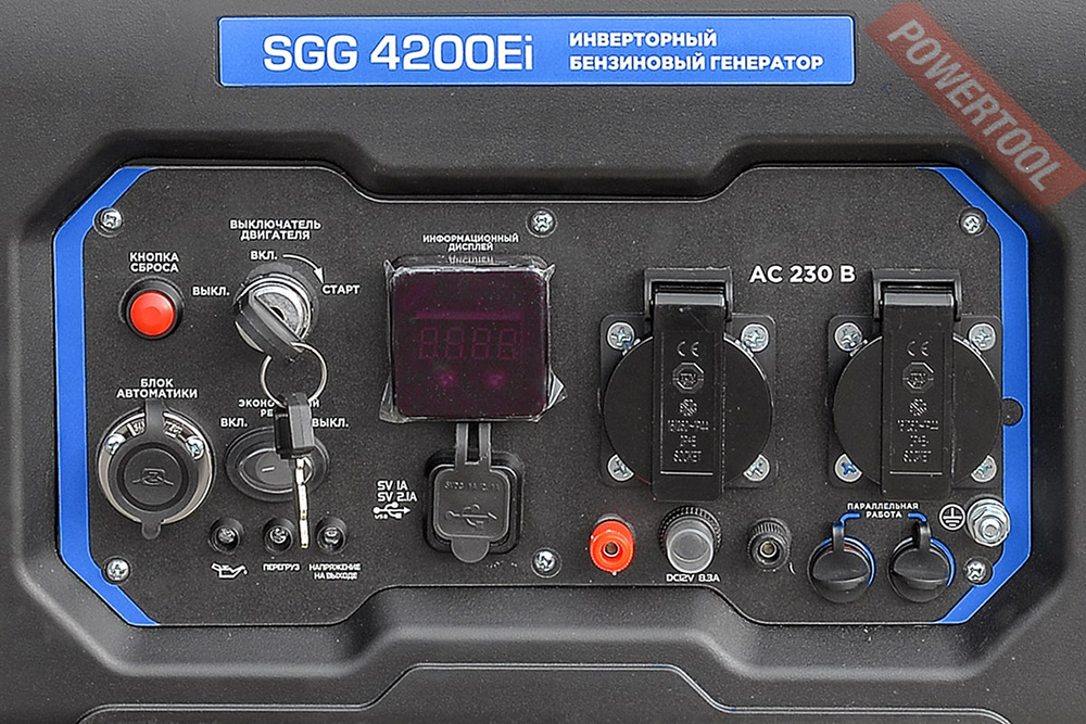 Генератор инверторный ТСС TSS SGG 4200Ei с электростартом и разъемом для подключения блока автоматики, вырабатывает электричество с высокой точностью частоты и напряжения. Предназначен для подключения к нему потребителей общей максимальной мощностью до 4,2 кВт. Позволяет подключать к генератору как обычных потребителей, так и точное электронное оборудование, например, ноутбуки, LCD-телевизоры или смартфон. Благодаря использованию В этой модели инверторного преобразователя, на выходе получается стабильный ток, без каких-либо скачков, генератор способен регулировать работу двигателя в зависимости от нагрузки: к примеру, если нагрузка составляет половину от выходной мощности, то и мощность двигателя снижается вдвое; это дает значительную экономию топлива, инверторные модели получаются более легкими и компактными, чем традиционные генераторы.