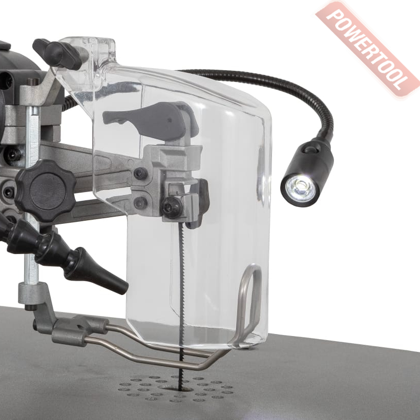 В этом станке можно использовать оба типа пилок, и со штифтами и прямые. Обдув зоны пиления через коленчатую трубку всегда можно расположить в месте, наиболее удобном для работы. Светильник подсветки тоже на гибкой стальной ноге. Он тоже не будет мешаться под руками, а будет подсвечивать именно в том месте, где он нужен. Верхнюю часть маятниковой рамы в работе можно легко поднимать в вернее положение для того, чтобы быстро продеть пилку через следующее отверстие и продолжить пилить.
