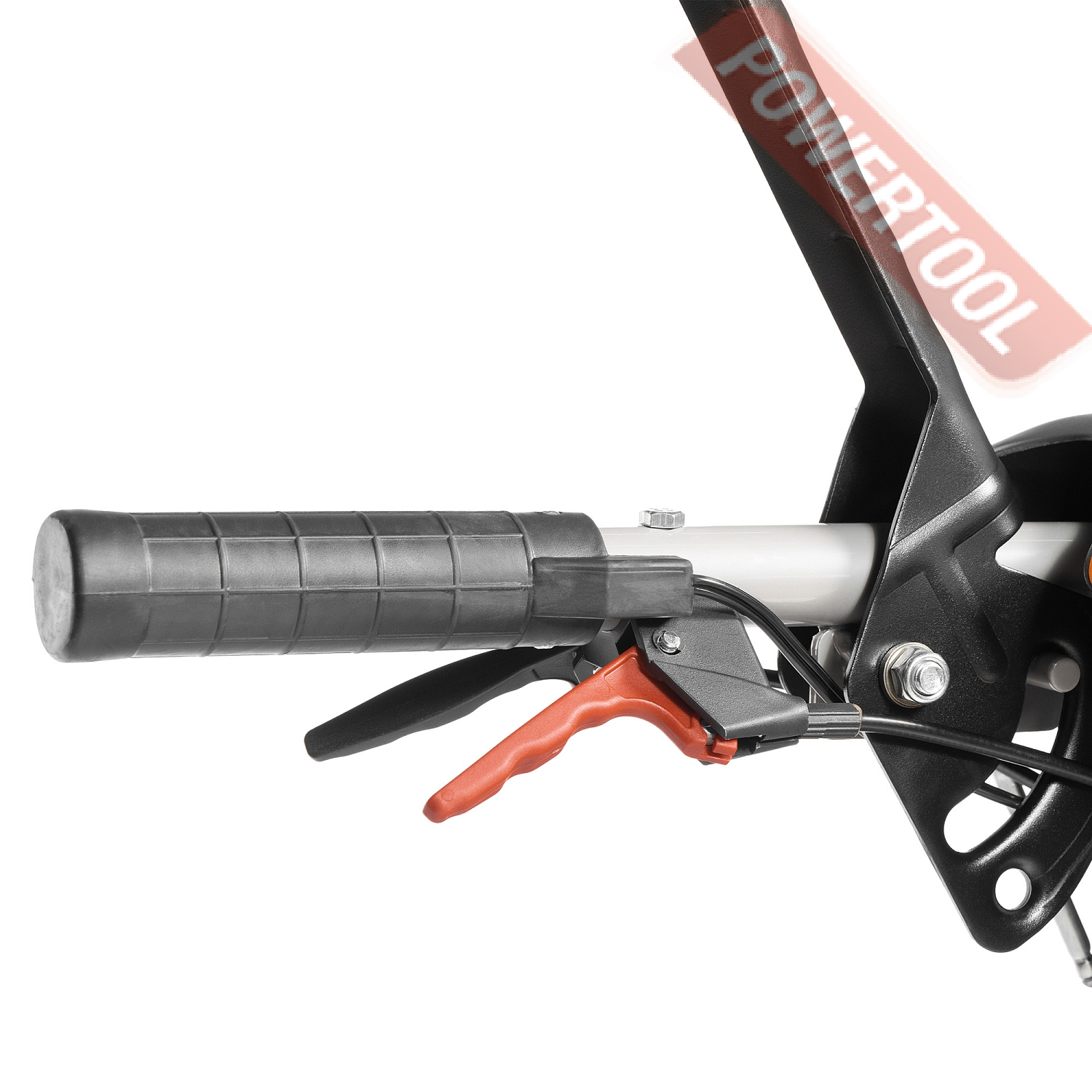 - Взаимная блокировка рукояток. Нажатие 2-х рукояток управления приводит к их взаимной блокировке. Это позволяет управлять снегоуборщиком одной рукой, и одновременно изменять направление и дальность выброса снега без остановки работы.
