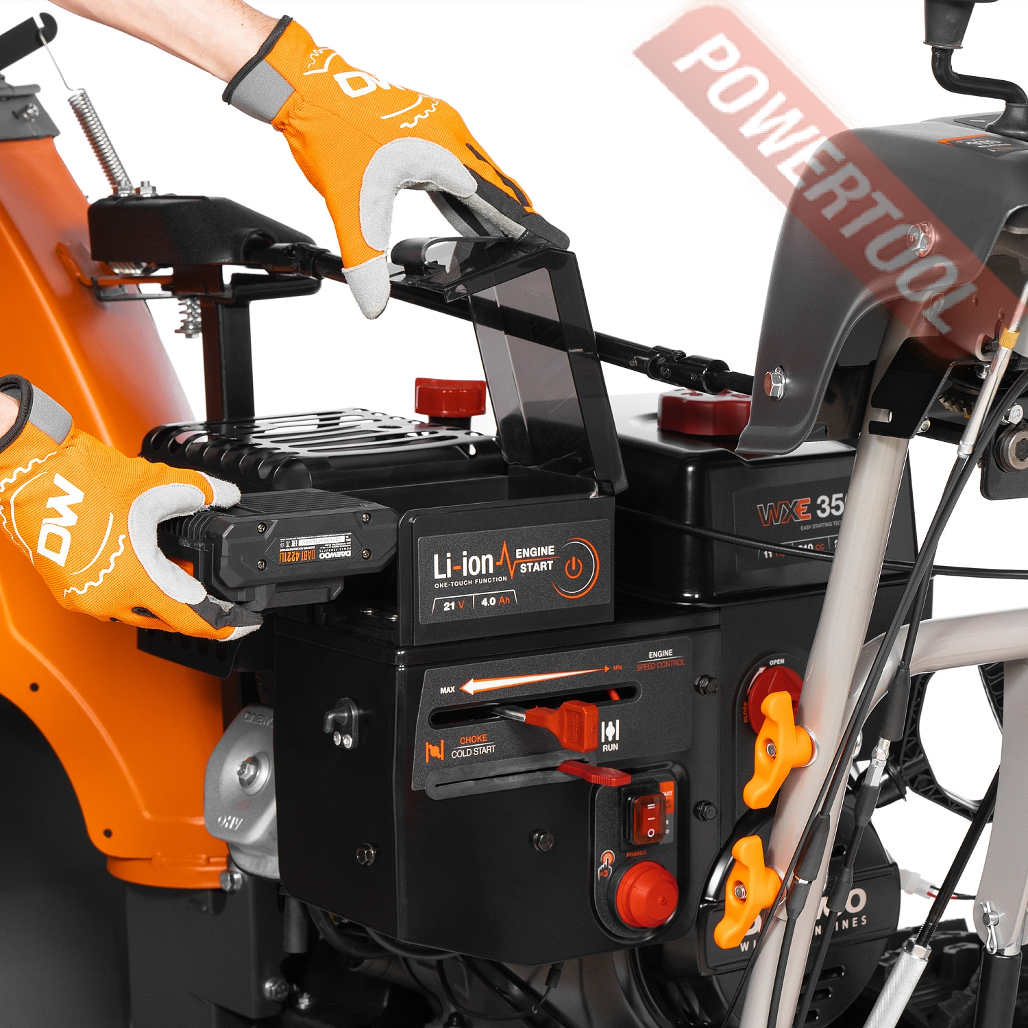- Двигатель DAEWOO зимней серии WXE 350. Уверенный запуск при отрицательных температурах. Электрозапуск от съемной батареи 21В. Повышенный моторный ресурс. Увеличенный глушитель и сниженный уровень шума.