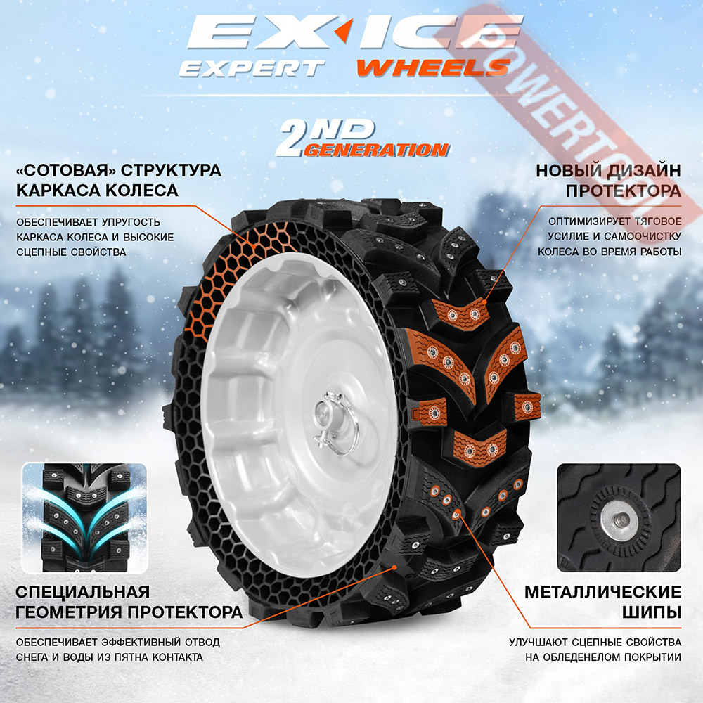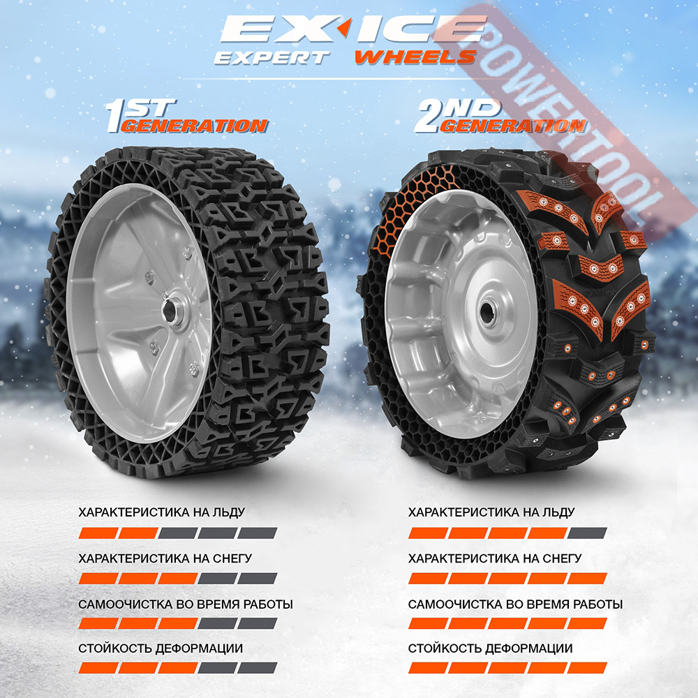 • Уникальные колеса EX‑ICE WHEELS. Широкие безвоздушные колеса созданы специально для снегоуборщиков. Колеса EX‑ICE обладают лучшим сцеплением с поверхностью среди всех зимних шин. Лучшая проходимость и маневренность в классе снегоуборщиков.