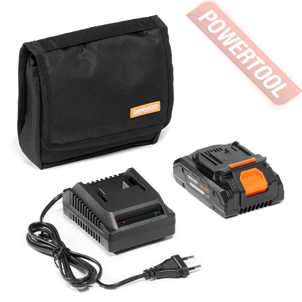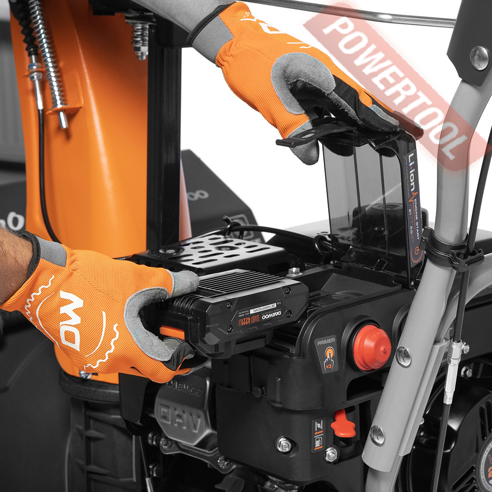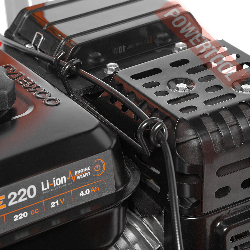 • Запуск от аккумулятора 21 Volt. Запуск двигателя путем нажатия кнопки Start. Питание от аккумулятора DAEWOO 21 Volt. Легкий запуск в любые морозы и возможность использования аккумулятора с шуруповертами DAEWOO.