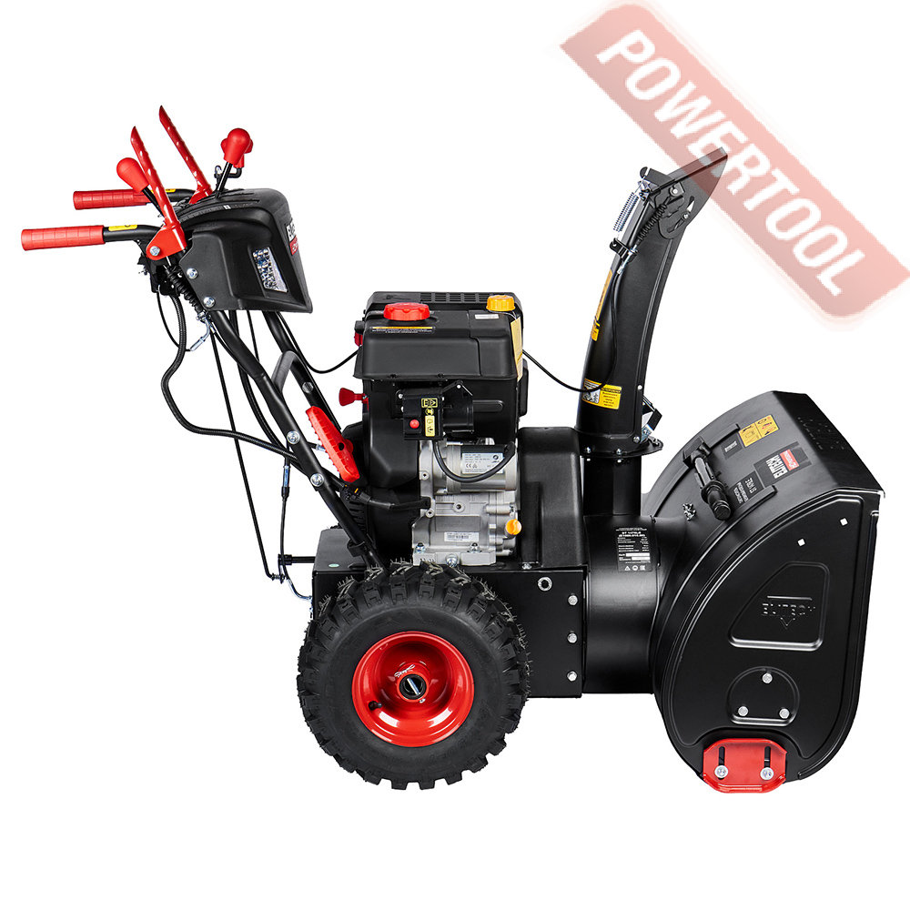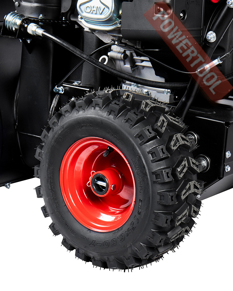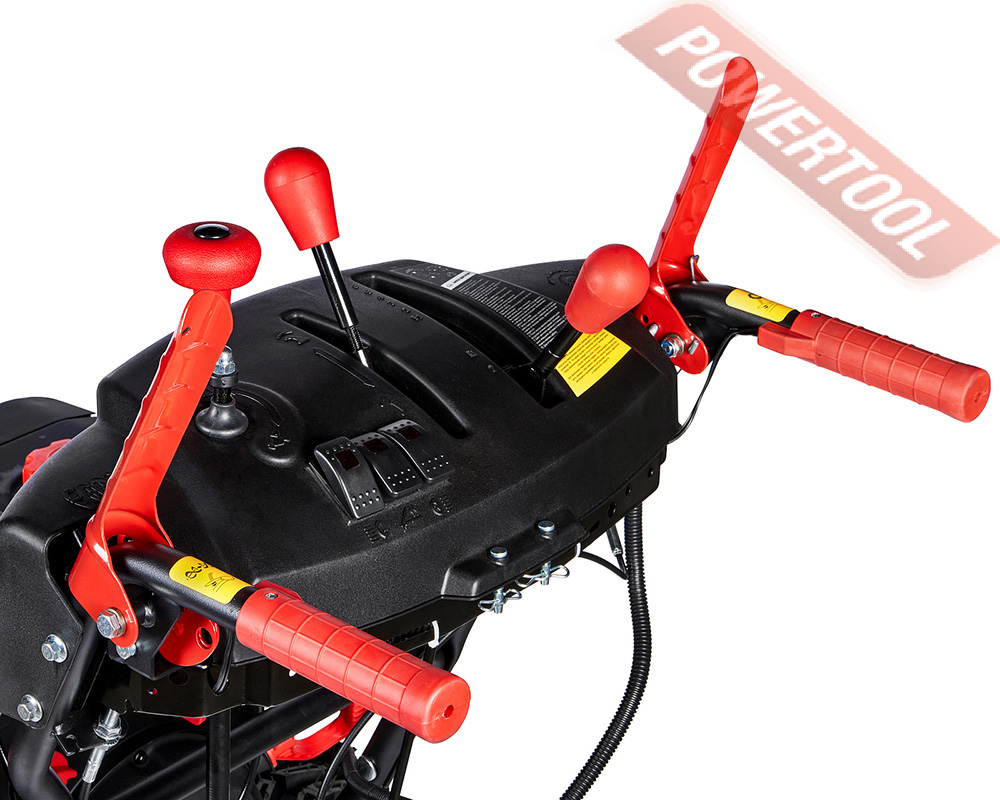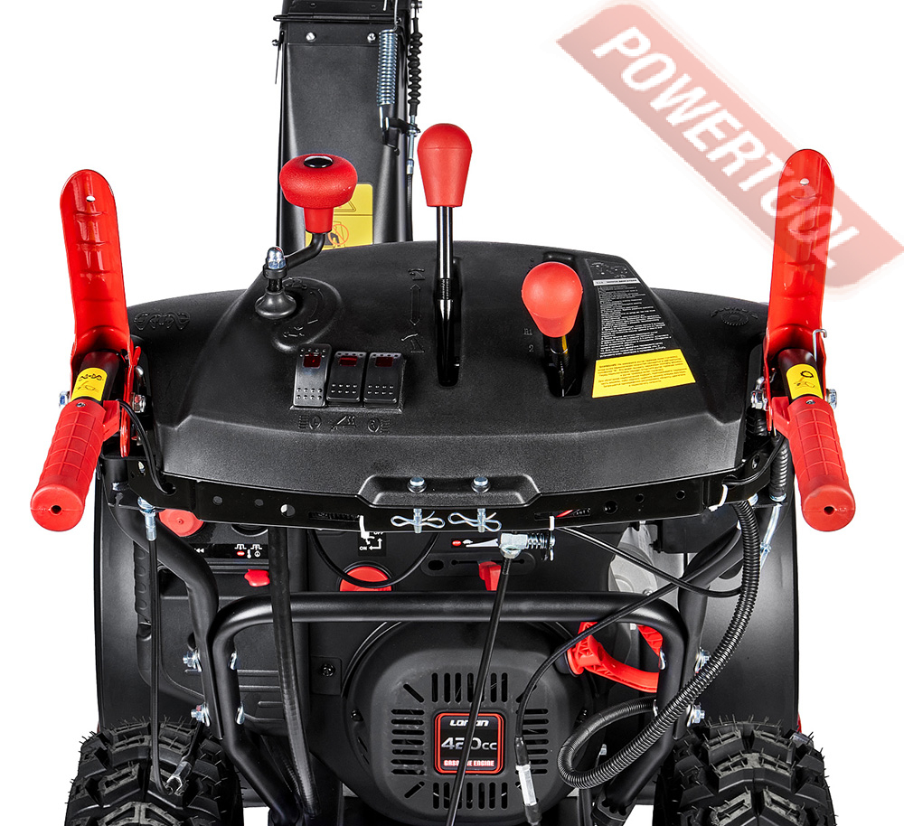 Снегоуборщик колесный самоходный, ширина ковша 76 см, высота ковша 54,5 см, скорости 6 вперед и 2 назад, выбор направления и дальности выброса снега рукоятками с панели оператора, угол поворота желоба 190 градусов, дальность выброса достигает до 15 м, подогрев рукояток, LED-фара, пневматические колеса 38 см, 4-тактный бензиновый двигатель Loncin LC190FDS объемом 420 куб.см мощностью 14 л.с., электростартер от сети 220 В, топливный бак 5,5 л, расход топлива 1,2 л/ч, емкость картера 1,1 л, трансмиссия фрикционный диск, габариты 1180х820х780 мм, вес 124 кг.
