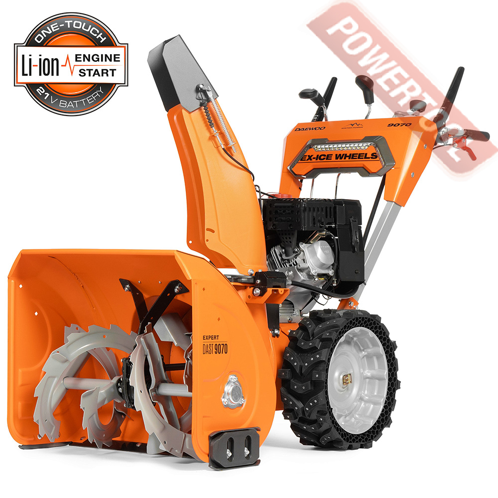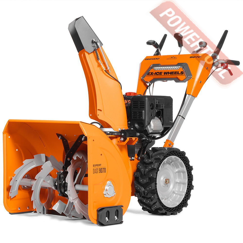 - Двухступенчатая система. Снег подается в кожух шнеком и затем выбрасывается крыльчаткой через желоб.