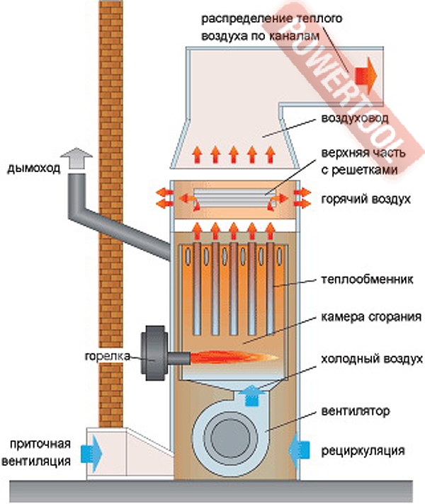 Теплогенератор может работать с горелками любого типа, газовыми, жидкотопливными или универсальными. В качестве топлива можно использовать отработанные или растительные масла, дизельное топлива, газ. Различные комплектации позволяют использовать его в системе вентиляционных каналов, в том числе возможно встроить теплогенератор в уже работающую систему вентиляции, обеспечить подогрев подаваемого внешнего воздуха, а также использовать теплогенераторы для получения технологического горячего воздуха для нагрева или сушки изделий.