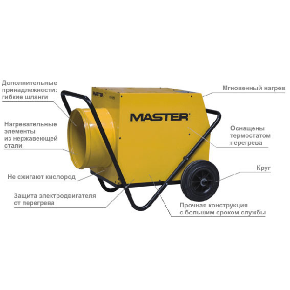 - Функция вентилятора. Аппарат способен работать как обычный вентилятор, создавая мощный направленный поток. Это позволяет использовать электрическую тепловую пушку MASTER даже летом.