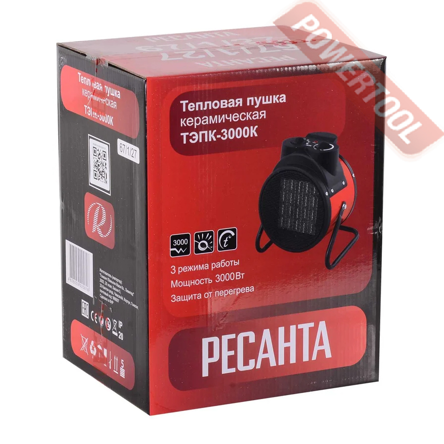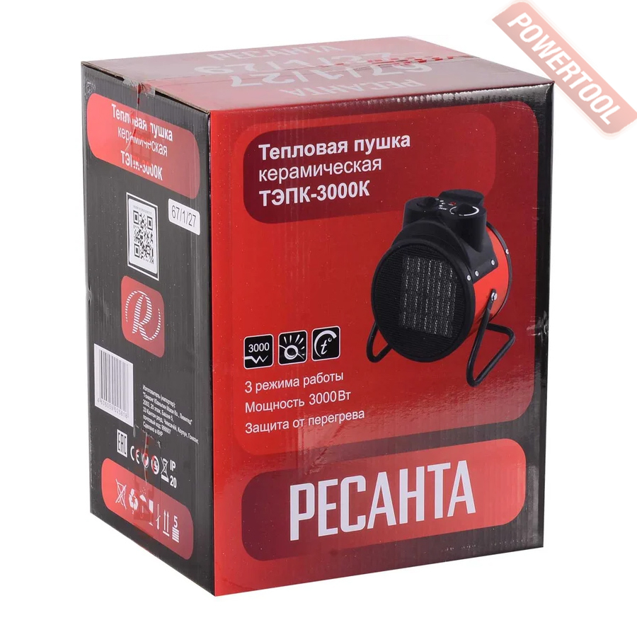 Тепловая пушка электрическая РЕСАНТА ТЭПК-3000К — надежный и эффективный нагревательный прибор для установки в неотапливаемых жилых помещениях, на бытовых складах, в гаражах и производственных цехах. Тепловая пушка может работать в качестве обычного вентилятора с мощностью 25 Вт для просушивания погребов или автоматически поддерживать нагрев в двух режимах: 2000 Вт и 3000 Вт. Этого достаточно для обеспечения комфортной температуры на площади до 30 м2.