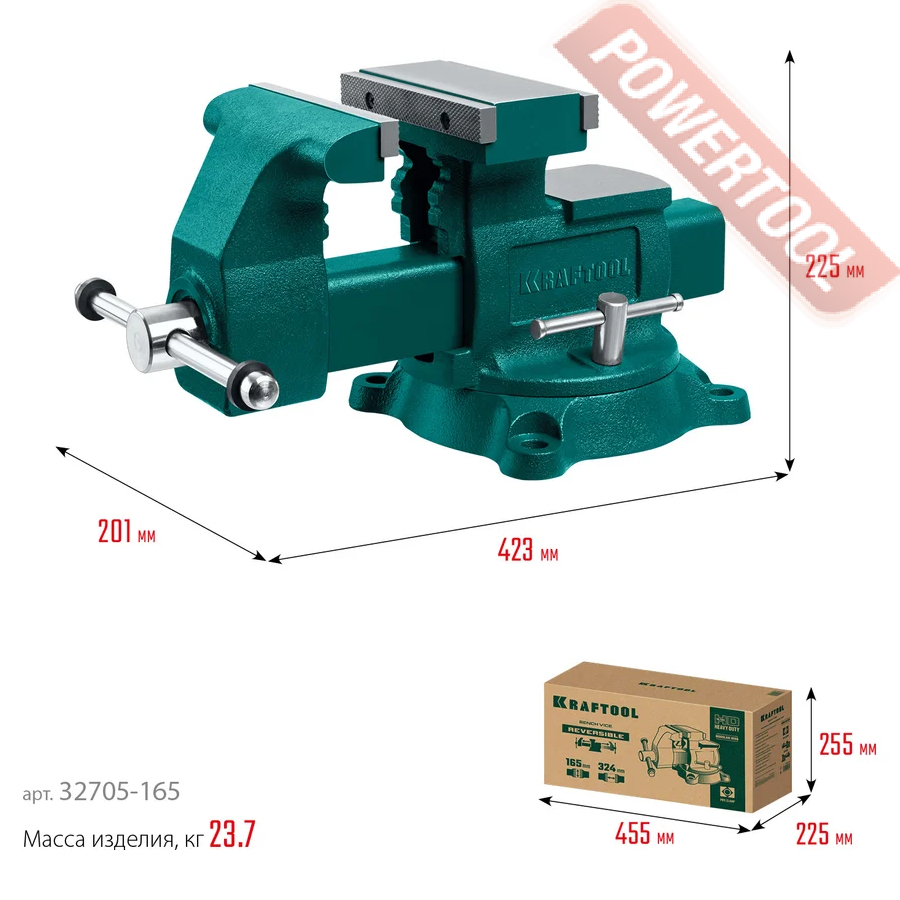 Тиски слесарные поворотные, ширина губок 165 мм, рабочий ход 324 мм, глубина зева 102 мм, 2 наковальни, усилие зажима 2800 кг, трубный зажим, функция поворота 360 градусов, размер ДхШхВ 423х201х225 мм, вес 23,7 кг.