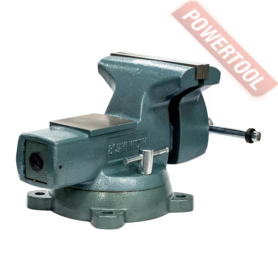 Тиски слесарные поворотные, ширина губок 203 мм, рабочий ход 216 мм, глубина зева 114,5 мм, размер наковальни 101х114,3 мм, диаметр зажима трубы 13,5-75,5 мм, функция поворота 360 градусов, размер ДхШхВ 500х270х290 мм, вес 38 кг.