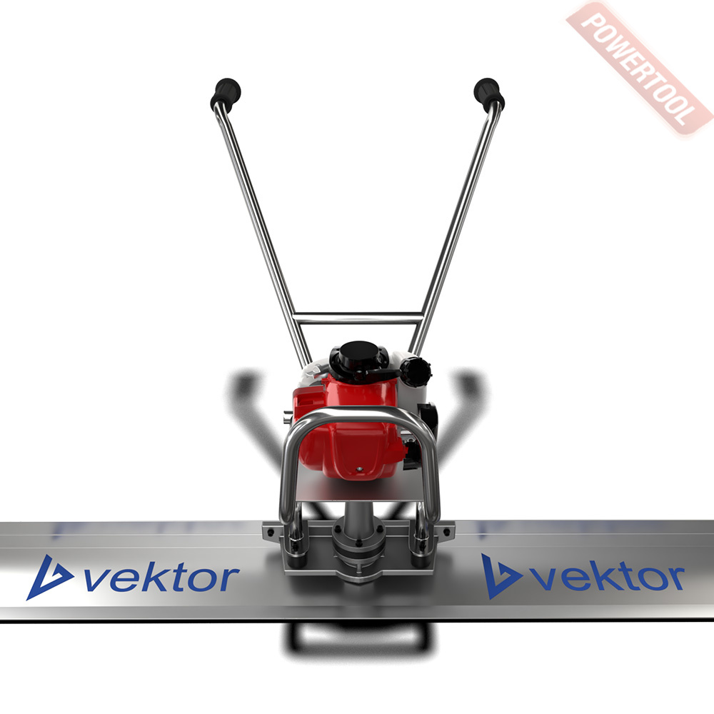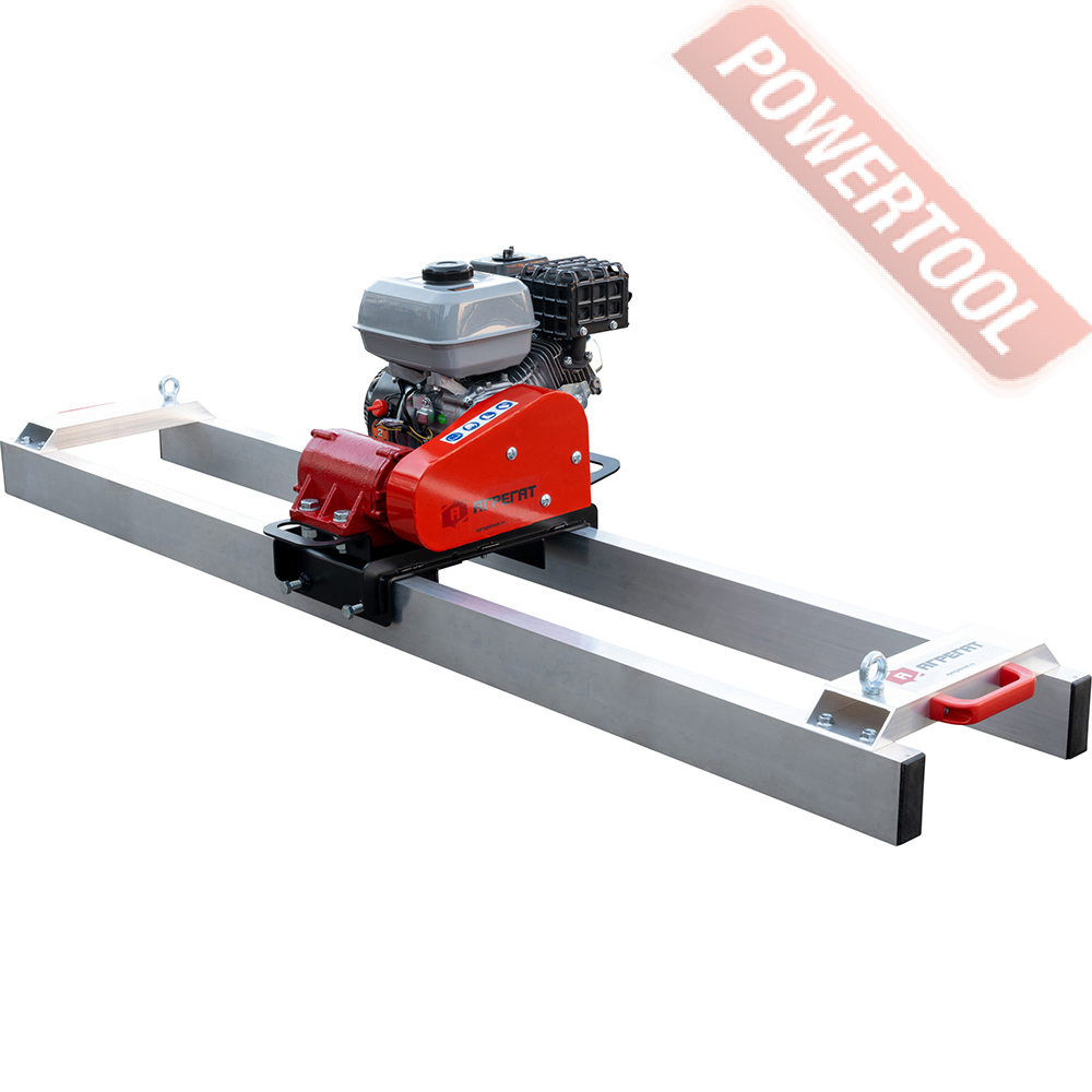 Виброрейка для бетона бензиновая ENAR Huracan L предназначена для уплотнения и выравнивания бетонных смесей при бетонировании дорог, полов, площадок в промышленном и гражданском строительстве. Виброрейки позволяют делать стяжку на бетонных смесях малой влажности (до 20 процентов воды). Уложить такой раствор традиционным способом достаточно трудно, смесь малоподвижна и плохо трамбуется. Под воздействием вибрации рейка сокращает до минимума пористость бетона и позволяет максимально равномерно распределить бетонную смесь. Виброрейка обеспечивает одинаково отличное вибрирование по всей длине лезвия. Главное: можно уложить в 4 раза больше бетона и более аккуратно. Плавающая виброрейка работает по направляющим или без них. Движение рейки обеспечивается за счёт того, что оператор тащит её за рукоятки на себя, а специальный профиль позволяет ей плыть по раствору даже без направляющих рельс-форм. Состоит из бензинового двигателя, топливного бака, алюминиевого профиля разной длины, груза-эксцентрика, расположенного в центре профиля и рукоятки управления. Бензиновый двигатель через приводной вал вращает груз-эксцентрик, в результате чего создаются вибрации.